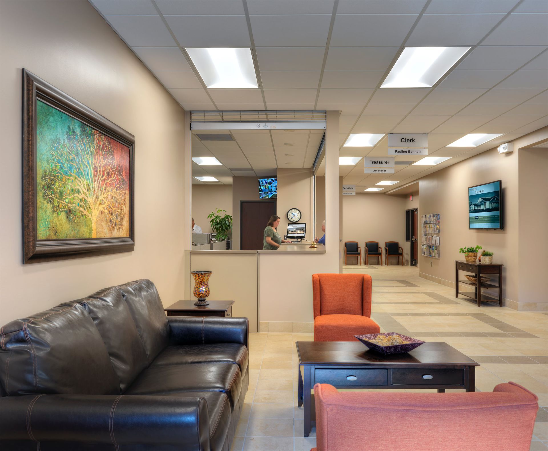 Key improvements included creating a large, centralized reception counter that offers visitors clear sightlines to all township departments, streamlining interactions and improving public service. Administrative offices were restructured to include open workspaces with built-in expandability, as well as views of the natural site surroundings, creating a more inviting work environment. The redesigned community room now features an open serving area integrated with the gathering space, enhancing its usability for events and meetings.
