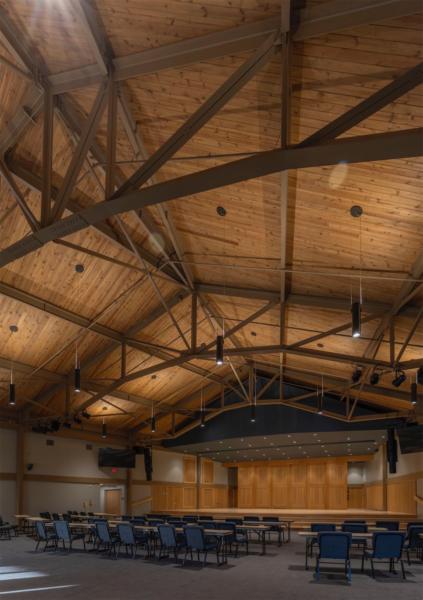 The lower level includes classrooms & meeting spaces designed for group discussions, workshops, and other programming needs, ensuring the new facility supports a wide range of uses. The chapel’s design emphasizes harmony with the natural surroundings, with views of the camp’s serene landscape. These elements create a welcoming environment that encourages inspiration and togetherness.