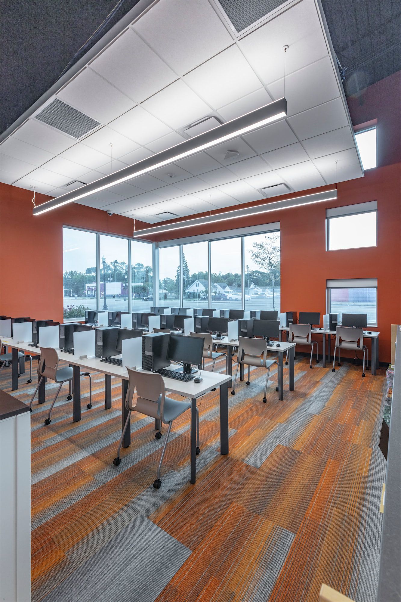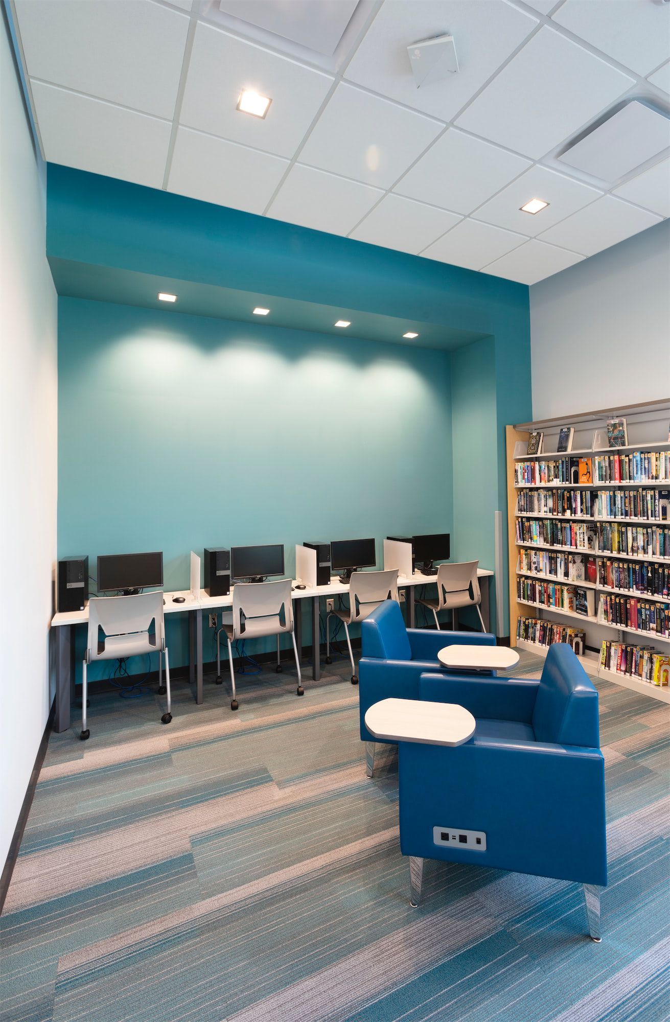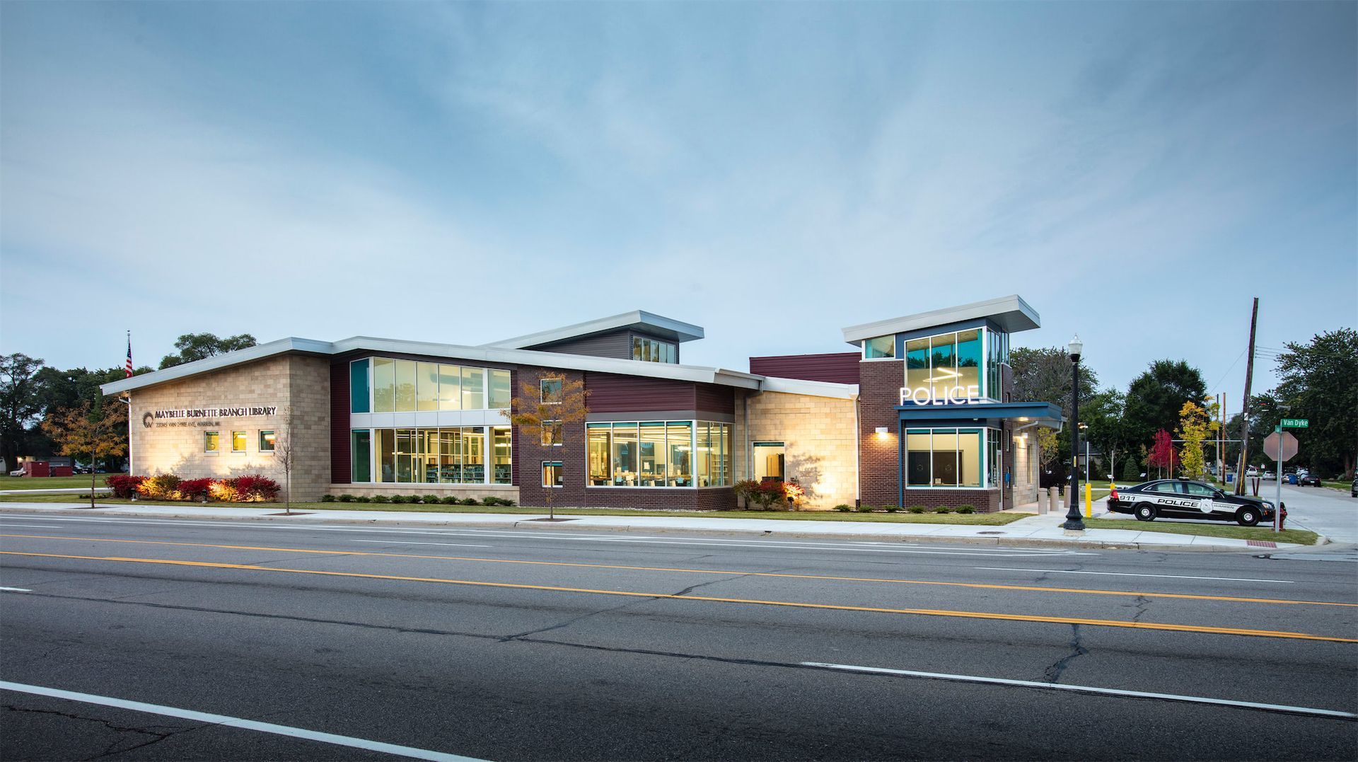 The new Maybelle Burnette Branch Library replaces an outdated facility originally built in the 1960s, delivering a modern, multi-functional space to serve the South Warren neighborhood. As part of a master-planned secondary Civic Center campus, the new library incorporates a satellite police station and a City Hall annex, significantly increasing services and resources available to the neighborhood.