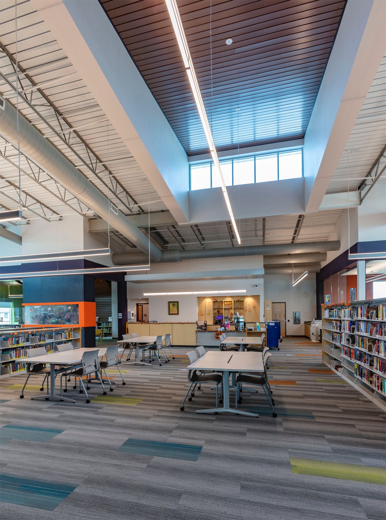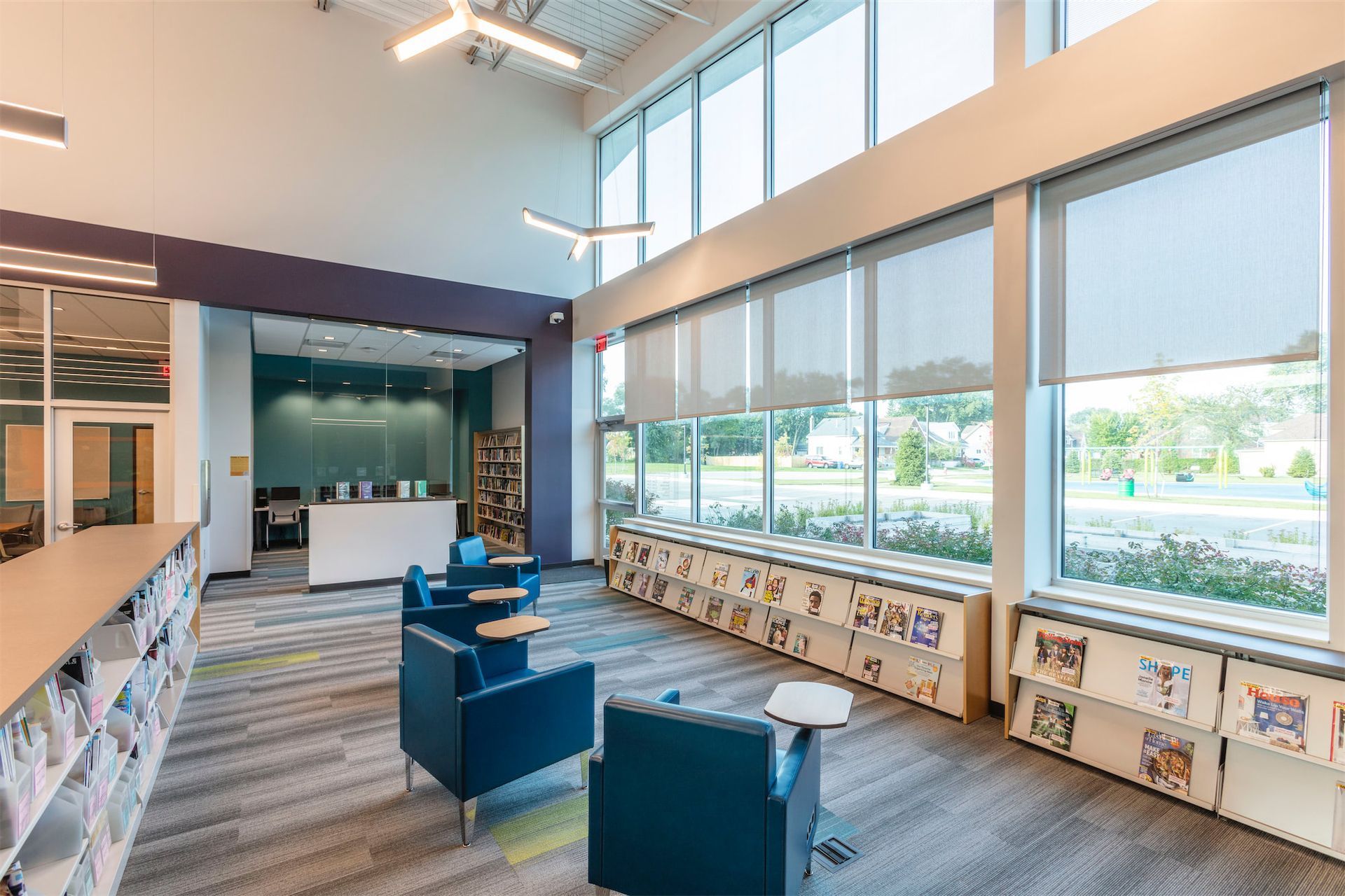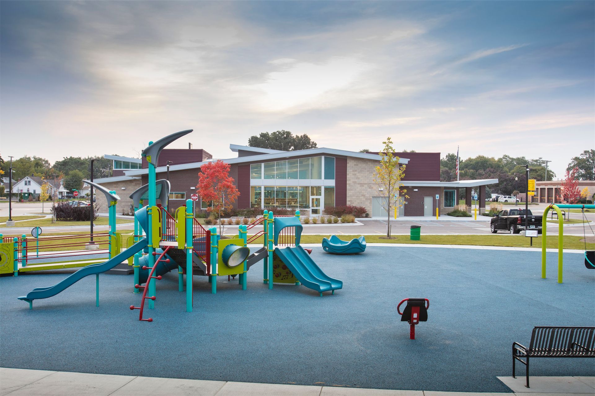 The site plan integrates the library into a broader vision for the area, featuring a park with trails, reading areas, an accessible playground, and provisions to accomodate a future fire station. This cohesive development enhances the neighborhood by promoting activity, connection, and safety. The satellite police station, housed in a secure wing of the building, provides additional stability and security to the surrounding area.