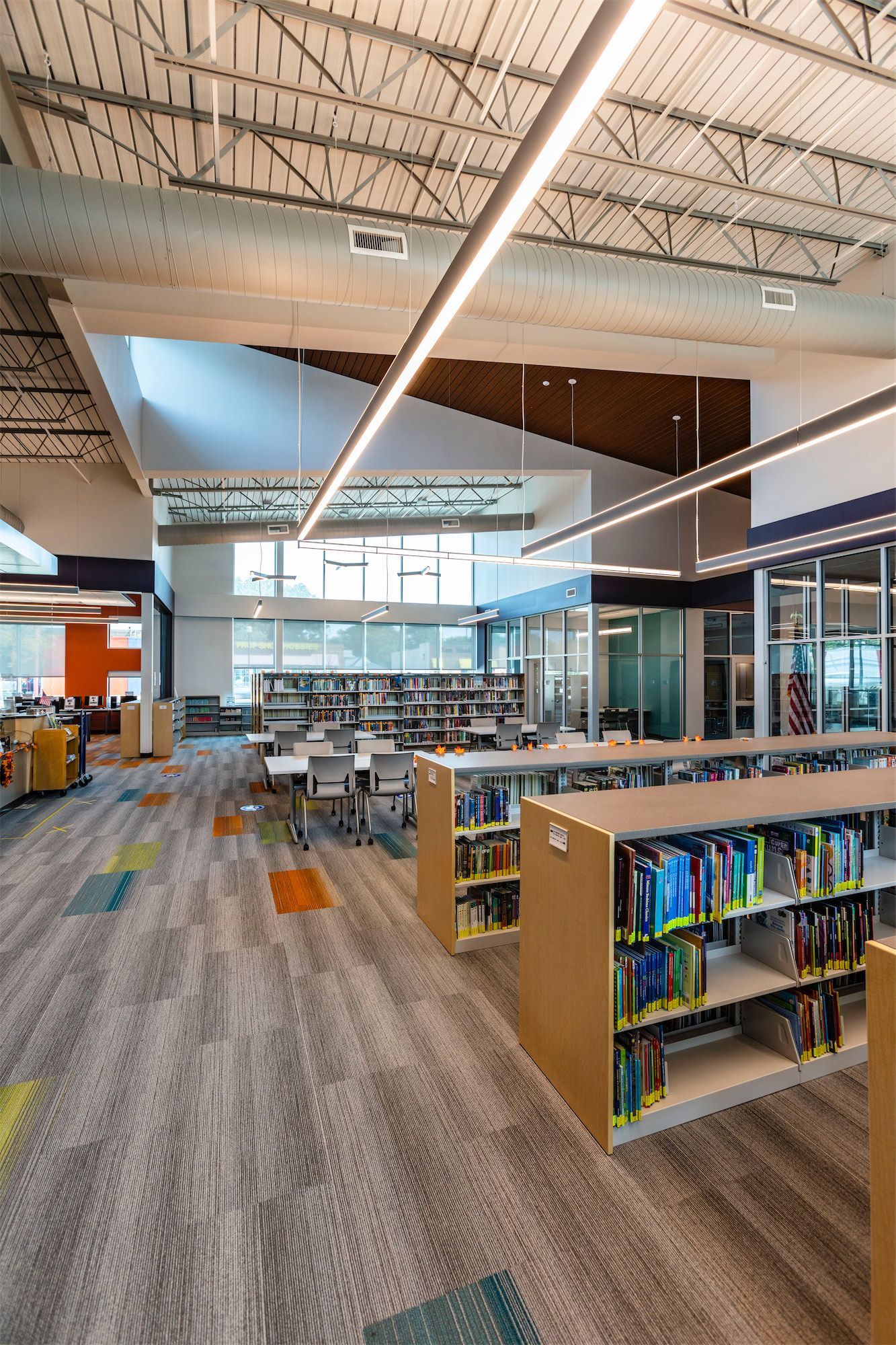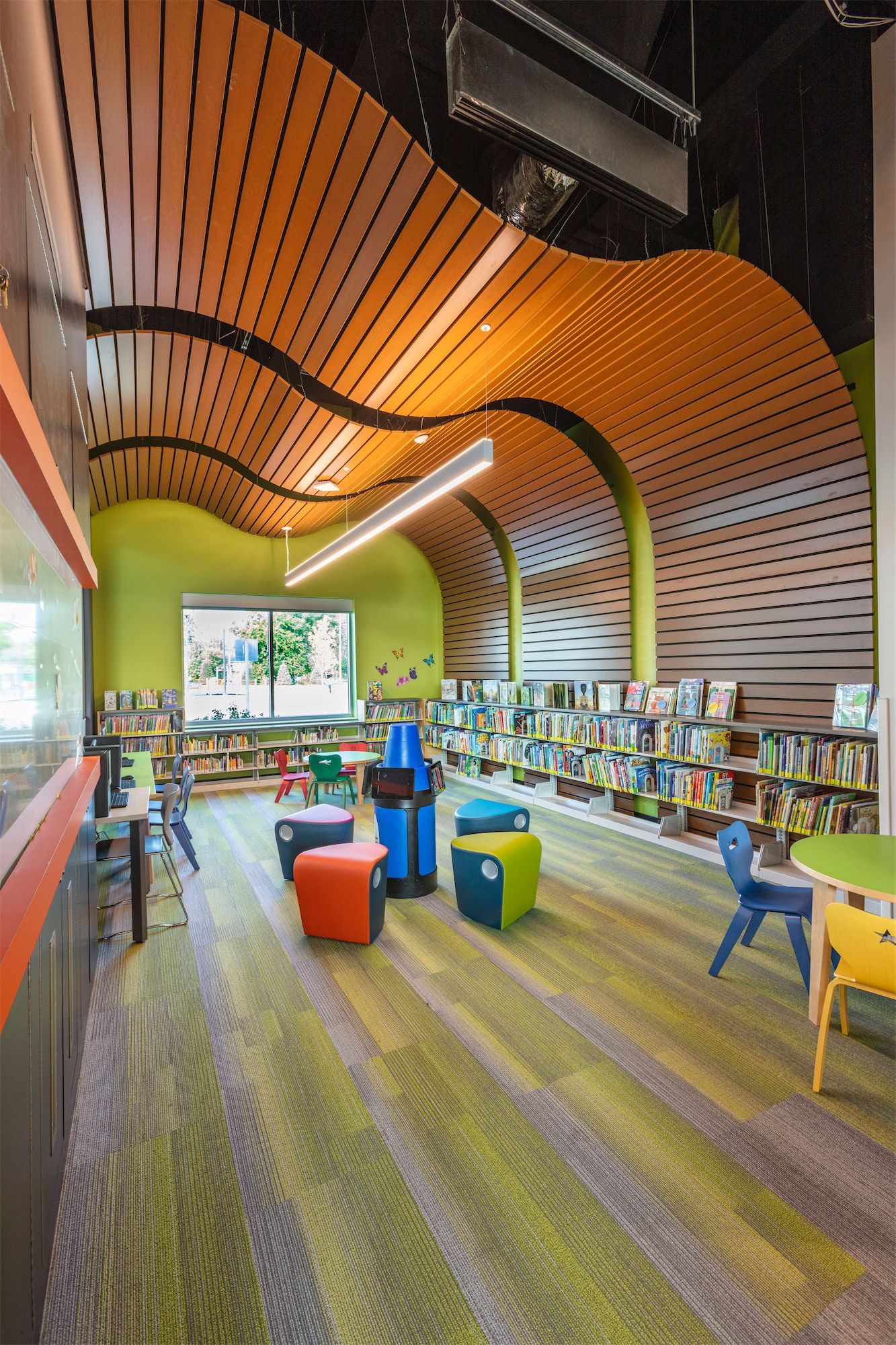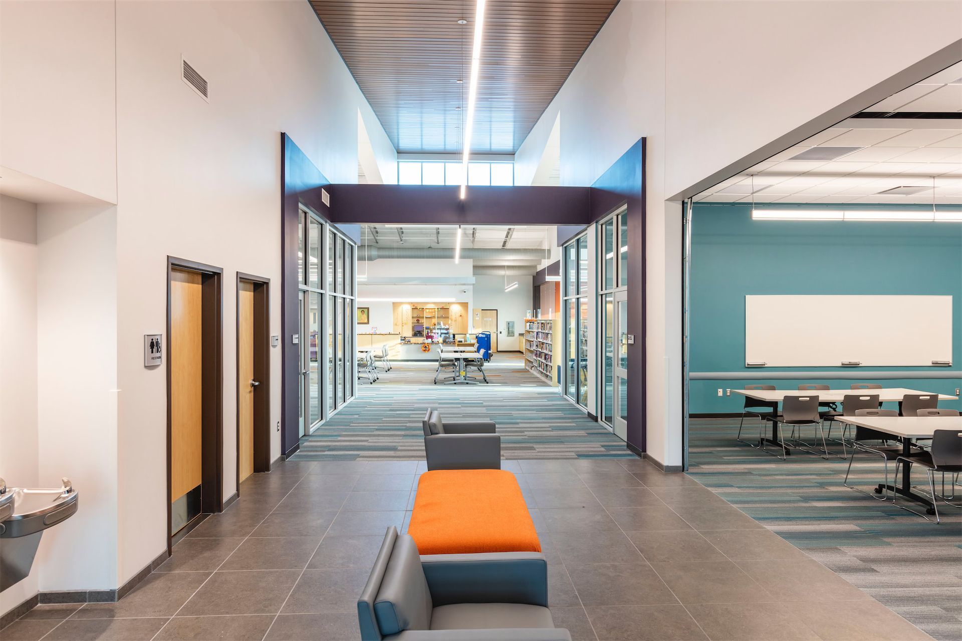 The site plan integrates the library into a broader vision for the area, featuring a park with trails, reading areas, an accessible playground, and provisions to accomodate a future fire station. This cohesive development enhances the neighborhood by promoting activity, connection, and safety. The satellite police station, housed in a secure wing of the building, provides additional stability and security to the surrounding area.