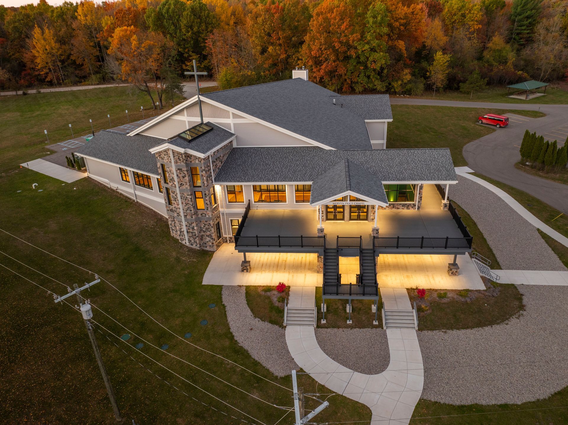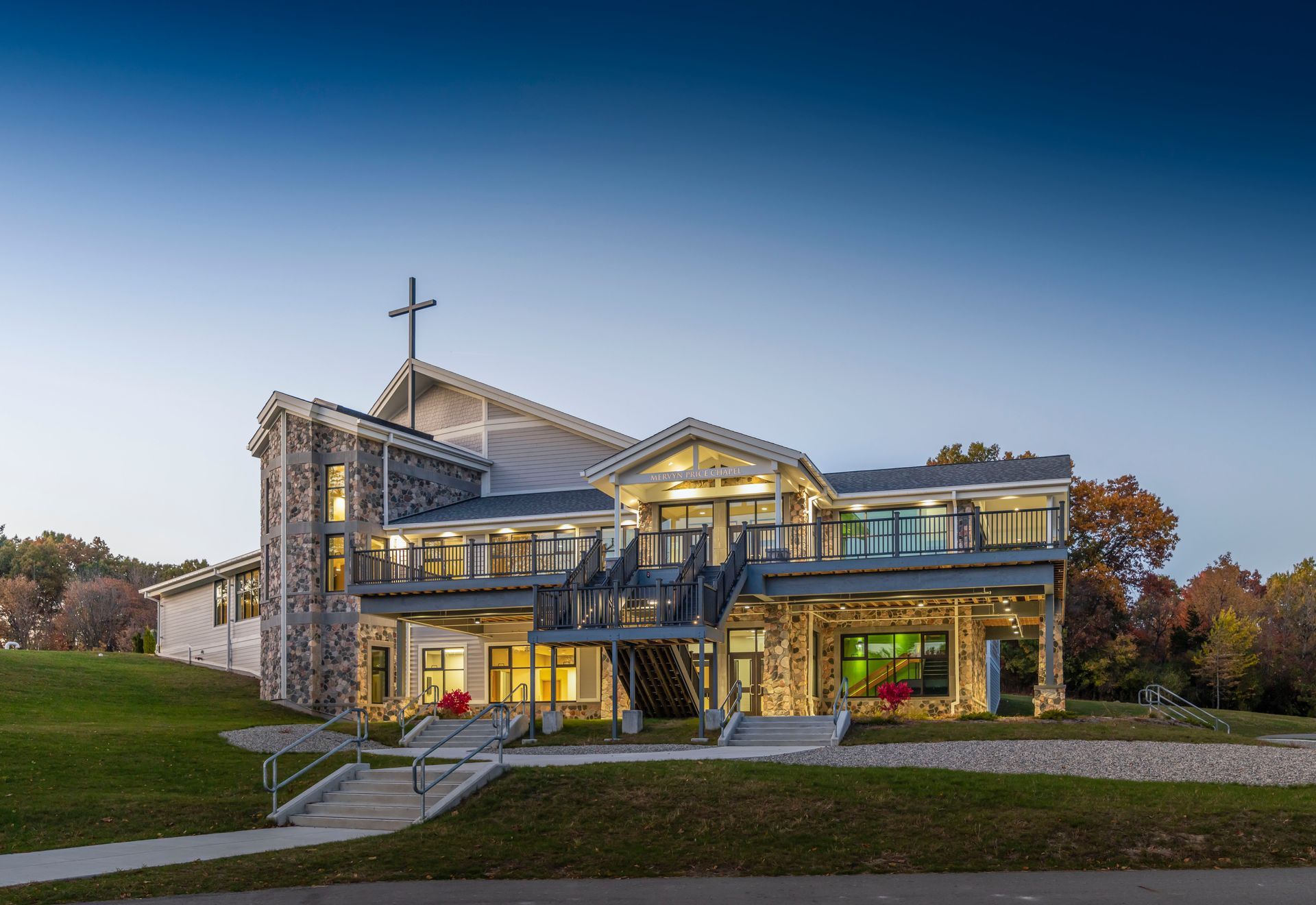 Located within the wooded landscape of the Salvation Army’s Echo Grove Camp in Leonard, Michigan, the new Mervyn Price Chapel and Performing Arts Center provides a dedicated space for gathering, reflection, and creative expression. Designed to support the camp’s youth, young adult, and overnight programs, the facility serves as a central venue for performances, worship services, and large group activities.