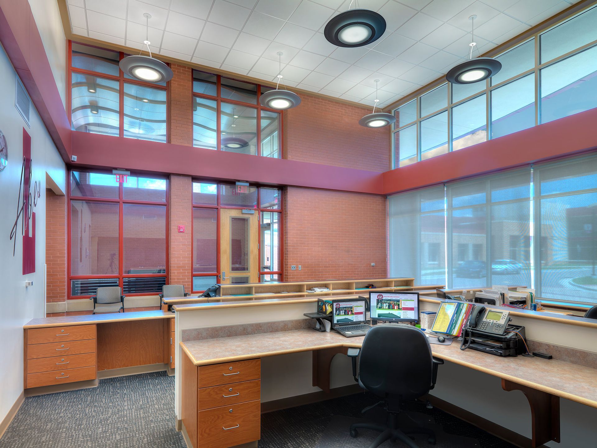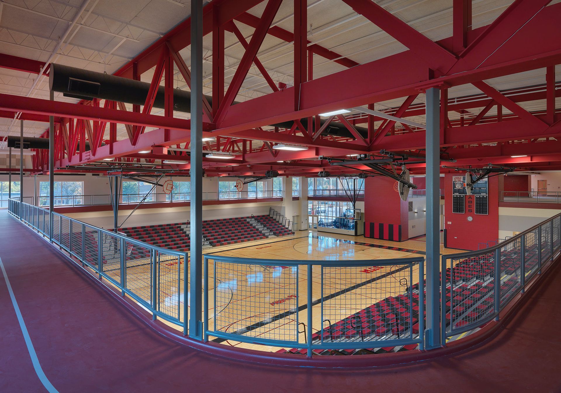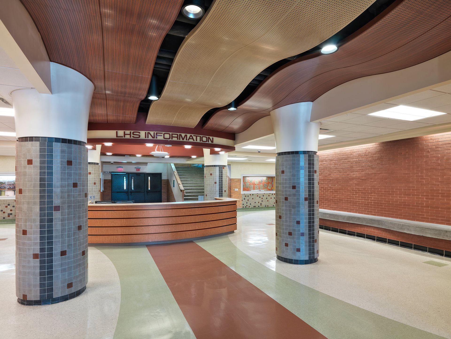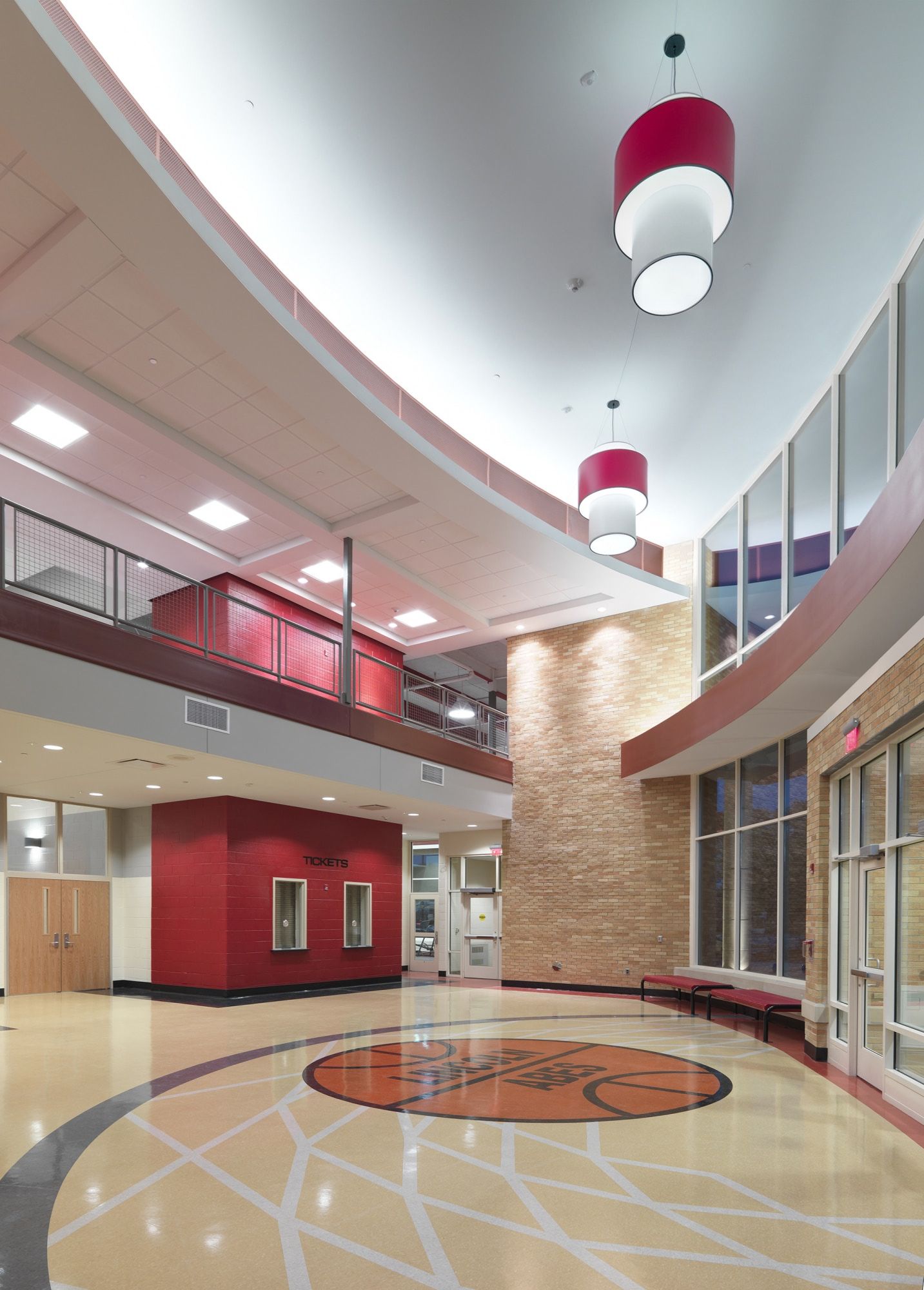 Building additions were constructed to house a new main gymnasium, locker rooms, main entry, secure vestibule, new administration area, media center and scene shop. Numerous interior renovations/reconfigurations transpired to allow for a larger cafeteria with increased serving lines, new school store, renovated art/drama areas, new science labs, new classroom spaces, as well as various mechanical and electrical upgrades. Reconfiguration of the entire site including parking, bus/parent traffic separation and overall site circulation was also included.