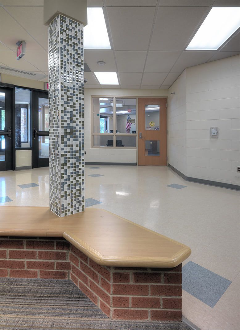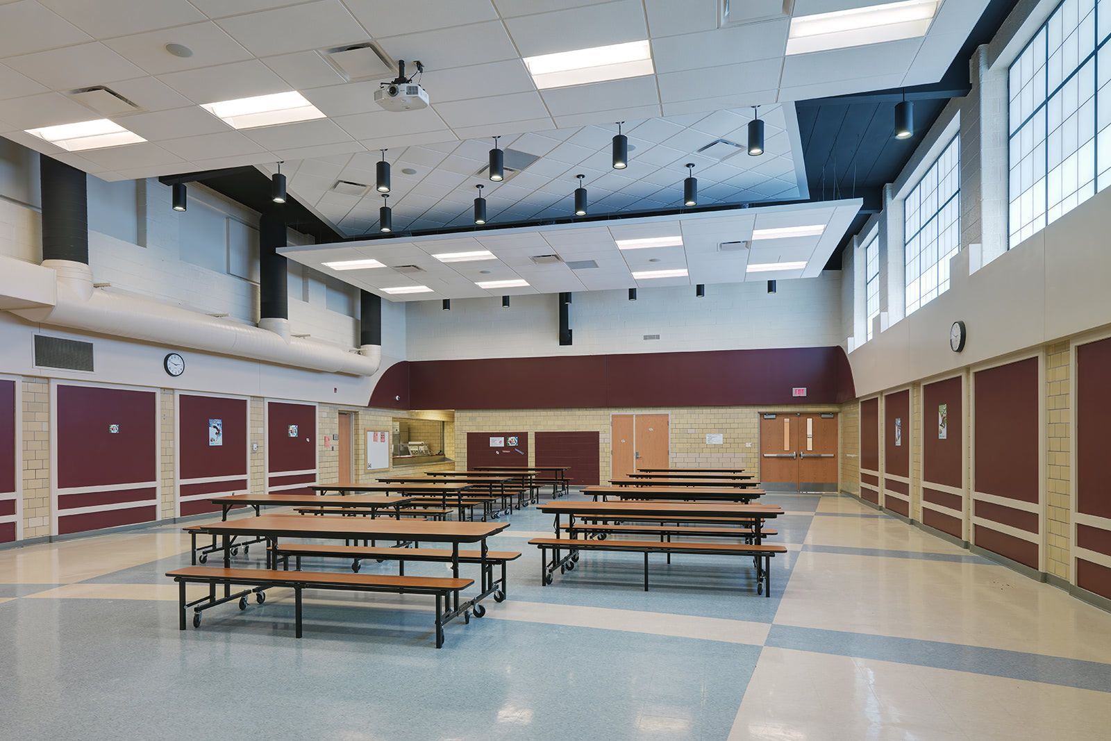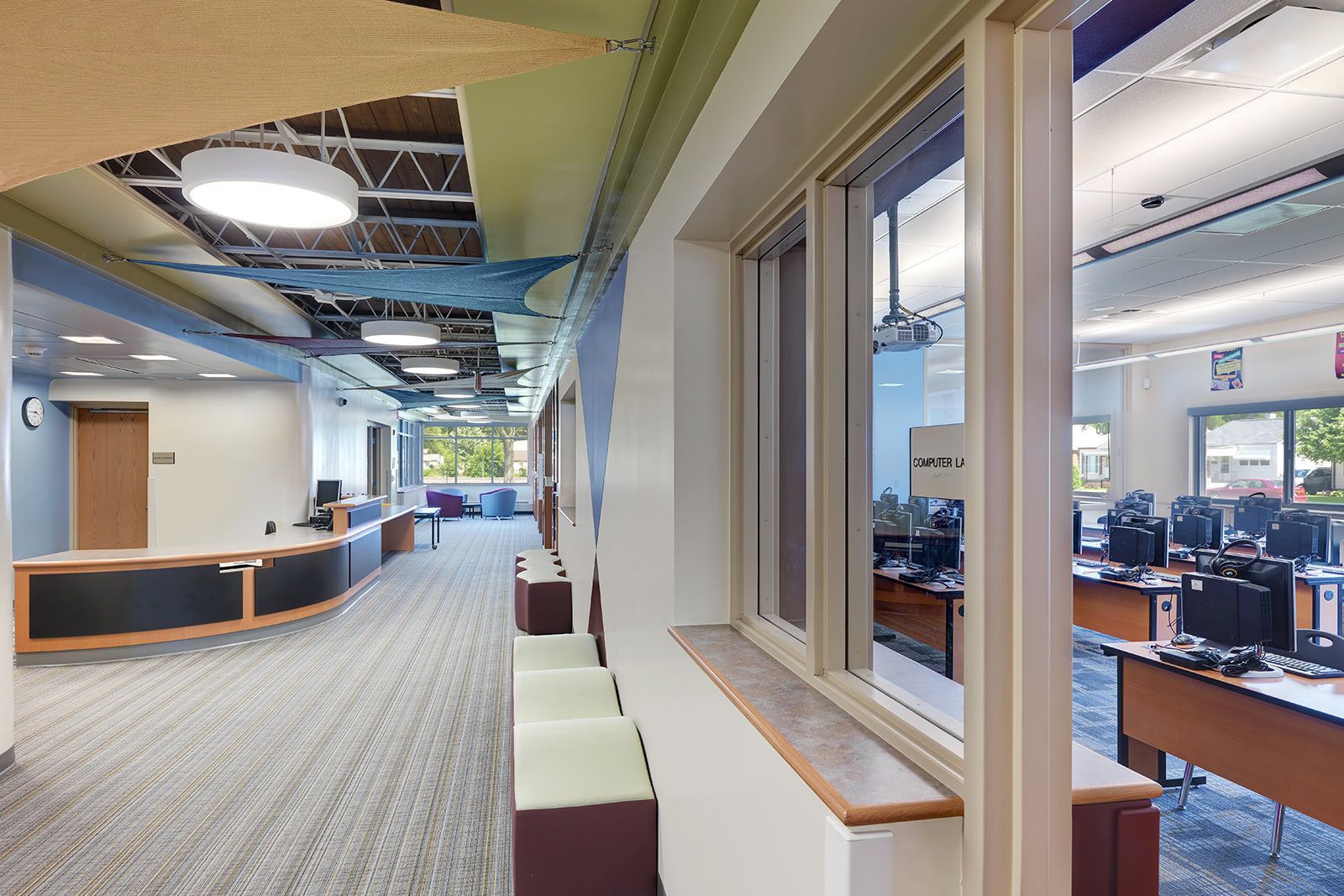 Security and accessibility improvements include a relocated administration area with a centralized security checkpoint, streamlining access for students, parents, and faculty. The renovation created new computer facilities and a multi-use media center in the space formerly occupied by administrative offices, maximizing the building's functional potential. Strategic use of passive lighting throughout creates inviting, high-performance learning spaces that reduce energy consumption.
