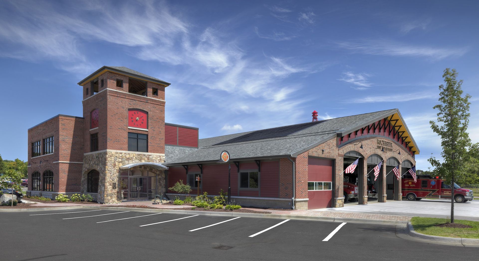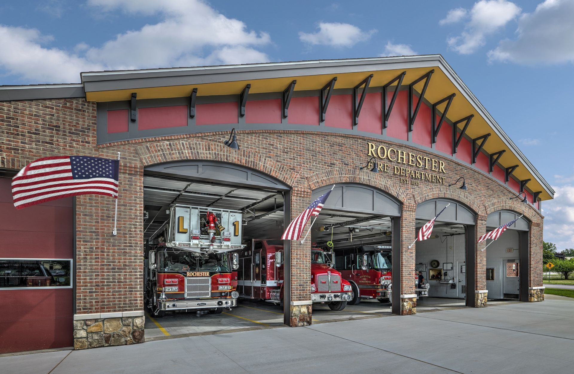 The Rochester Fire Station renovation demonstrates how creative design can transform an industrial facility into a community landmark while honoring the city's historic downtown character. Working within a modest $400,000 budget, PARTNERS led a comprehensive redesign that balanced aesthetic improvements with functional upgrades. The project's main challenge was redefining the existing industrial appearance through traditional architectural elements that would complement both the new addition and downtown Rochester's historic fabric.