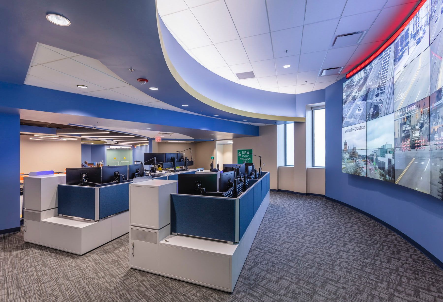 The City of Detroit Police and Roads Department worked with PARTNERS in Architecture, through the Detroit Building Authority, to design and engineer the innovative Real Time Crime Center as part of the “Green Light Project.” This ambitious initiative involved repurposing existing space within the Detroit Police Headquarters to create a cutting-edge facility focused on real-time crime monitoring and response coordination. Delivered as a Design-Build, Guaranteed Maximum Price GMP project, the work had to meet an extremely tight budget and timeline while achieving specific program objectives.