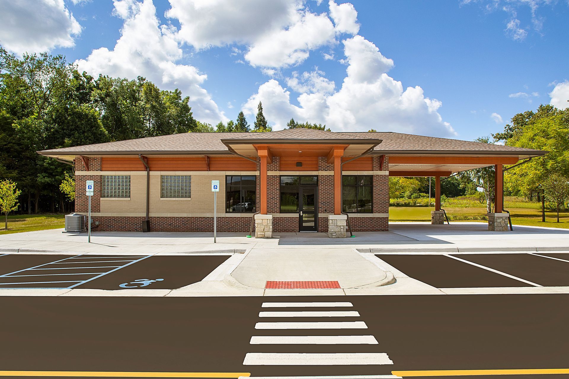 The Parks & Recreation component includes a trailhead building for Legacy Park, providing public restrooms and water access that support both daily park users and community events. The public safety lobby also incorporates a medication drop-off, offering residents a safe and convenient service point.