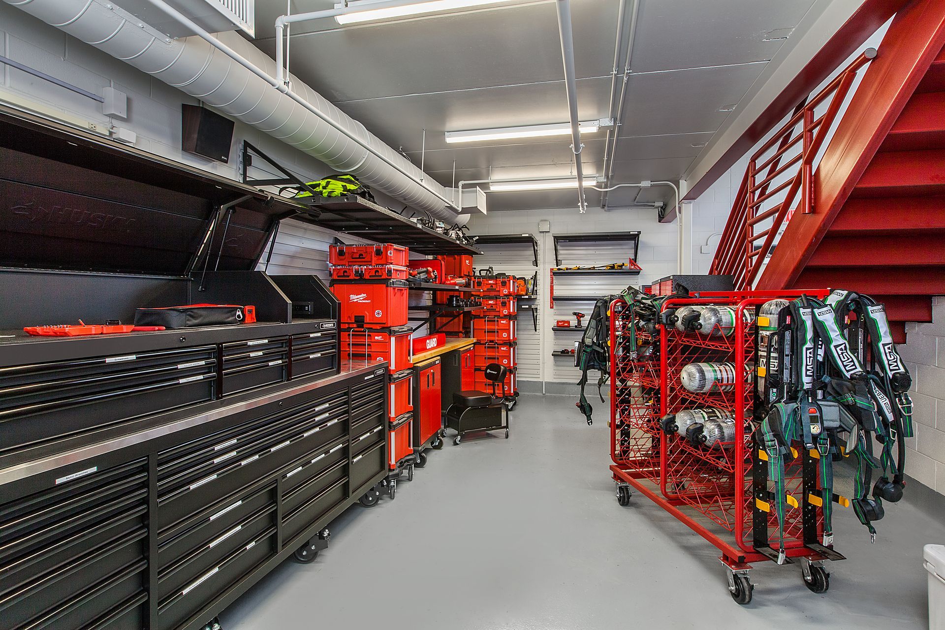 Operational support spaces throughout the complex are designed to maximize efficiency and uptime. Dedicated maintenance and equipment areas support inspection, cleaning, and repair of apparatus, tools, and breathing equipment, while strategically located support spaces allow quick access to vehicles and gear during emergency responses. The Public Works Department occupies a new headquarters designed to replace outdated facilities and better support the Township’s growing infrastructure needs.